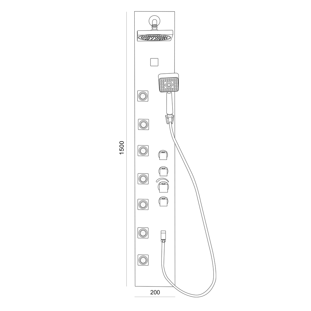 Columna de hidromasaje termostática Serie Nitro. Accionamiento mediante volante. Incorpora: 7 Jets orientables anti cal, brazo de ducha 20x20 cm anti cal, Maneral de ducha 2 funciones anti cal, flexo metálico de 150 cm y panel de aluminio anodizado 1500x200 mm. Presión mínima 2 bar y presión máxima: 5 bar. Acabo aluminio cromo.